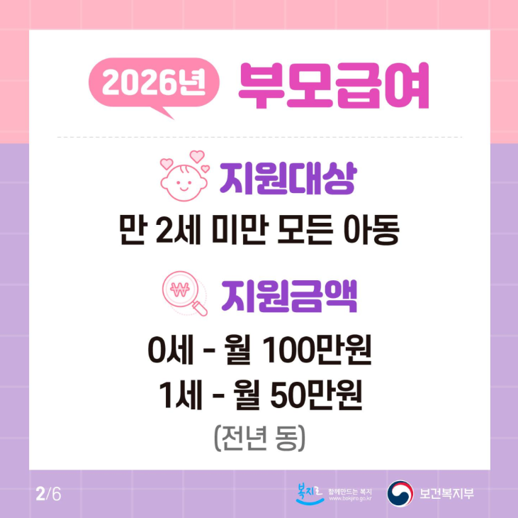 영아를 양육하는 가정이라면 매달 고정적으로 발생하는 양육비 부담을 체감하게 됩니다. 특히 생후 0~1세 시기는 돌봄과 생활비 지출이 동시에 집중되는 시기로, 가계 부담이 가장 큰 구간이라고 할 수 있습니다. 이러한 현실을 반영해 정부에서는 부모급여 제도를 통해 영아 양육 가정에 현금성 지원을 제공하고 있습니다. 부모급여는 사용처 제한 없이 현금으로 지급된다는 점에서 실제 체감도가 높은 제도입니다. 이번 글에서는 2026년 기준으로 부모급여 제도의 핵심 내용을 정리해, 누가 받을 수 있는지, 얼마를 언제까지 받을 수 있는지, 그리고 신청 방법까지 직관적으로 안내드립니다.