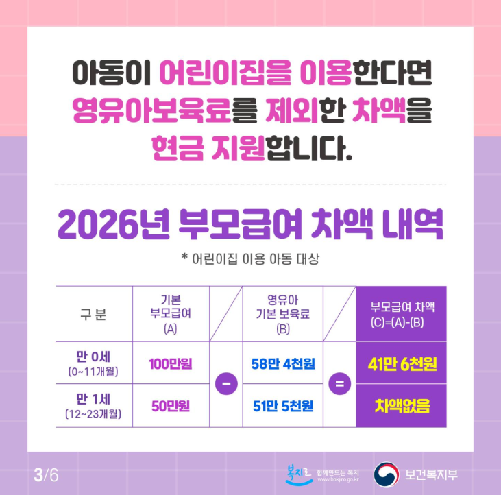 어린이집을 이용하는 경우에는 지급 구조가 일부 달라집니다. 0세 아이가 어린이집을 이용할 경우 보육료 바우처 전액이 우선 지원되며, 이후 일부 금액이 현금으로 지급됩니다. 1세 아이 역시 보육료 지원 후 차액 형태로 현금이 지급됩니다.