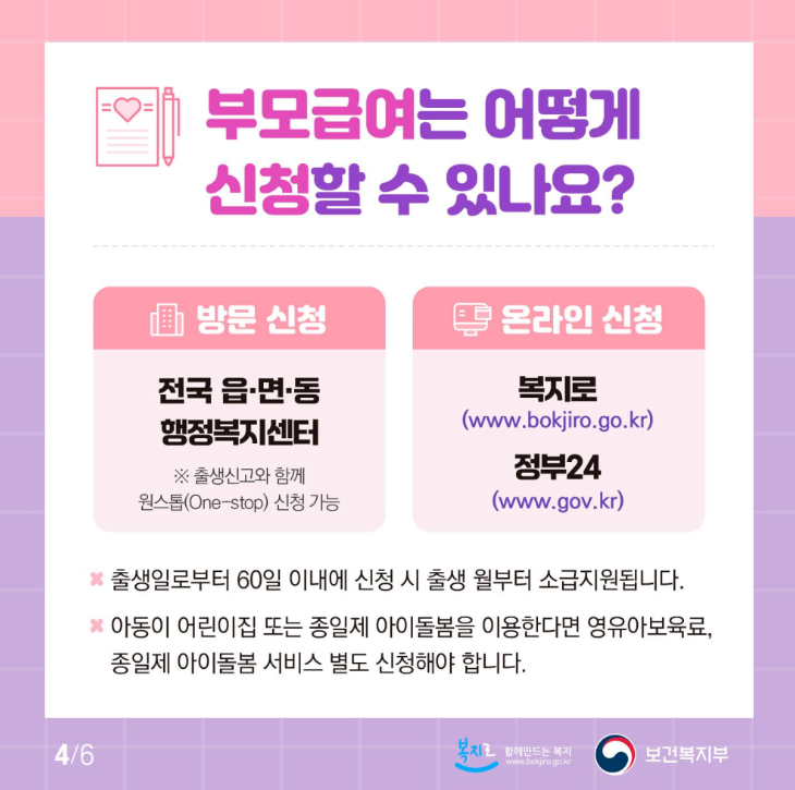 부모급여는 자동으로 지급되지 않기 때문에 반드시 보호자가 직접 신청해야 합니다. 신청 방법은 거주지 관할 읍·면·동 행정복지센터를 방문하는 방법과, 복지로 홈페이지를 통한 온라인 신청 방법이 있습니다.