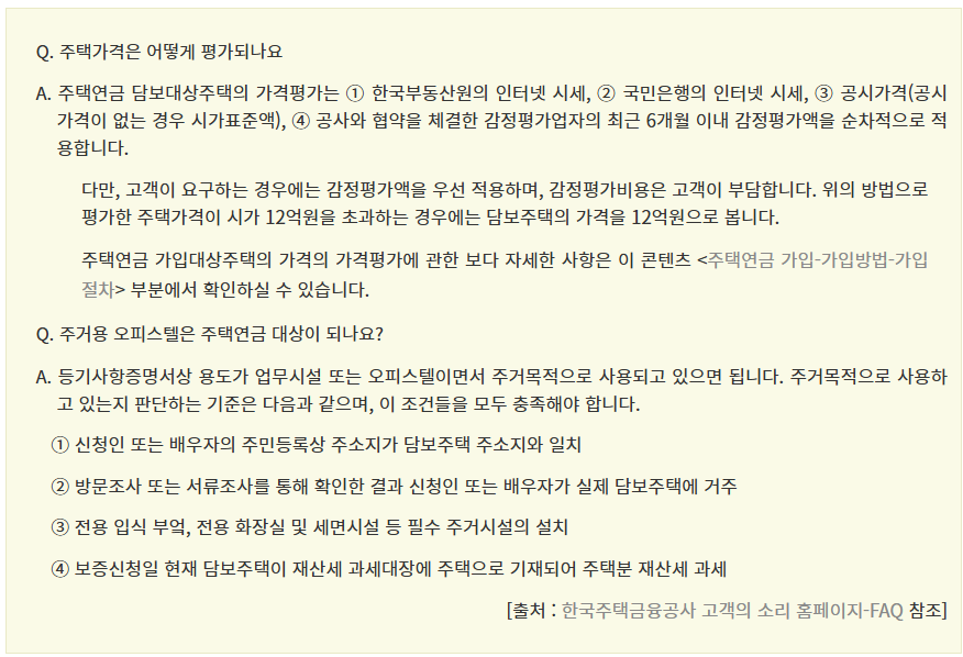가입 가능한 주택 유형에는 일반적인 아파트와 단독주택뿐만 아니라 노인복지주택도 포함됩니다. 또한 주거 목적으로 사용하는 오피스텔 역시 일정 조건을 충족하면 주택연금 대상이 될 수 있습니다.