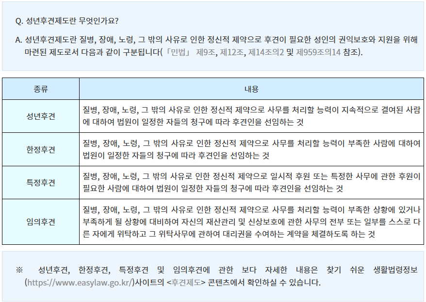 이럴 때 활용할 수 있는 제도가 바로 성년후견제도입니다. 성년후견제도는 판단 능력이 저하된 어르신을 대신해 법원이 지정한 후견인이 재산 관리와 중요한 계약을 도와주는 제도입니다.