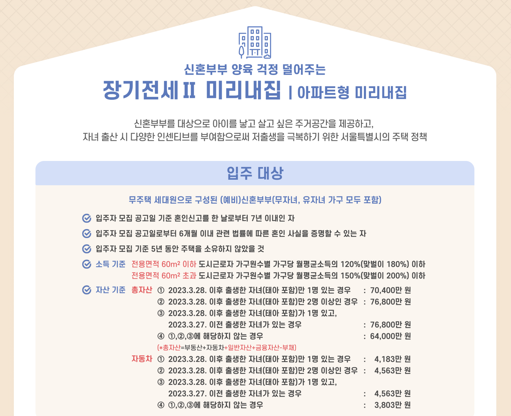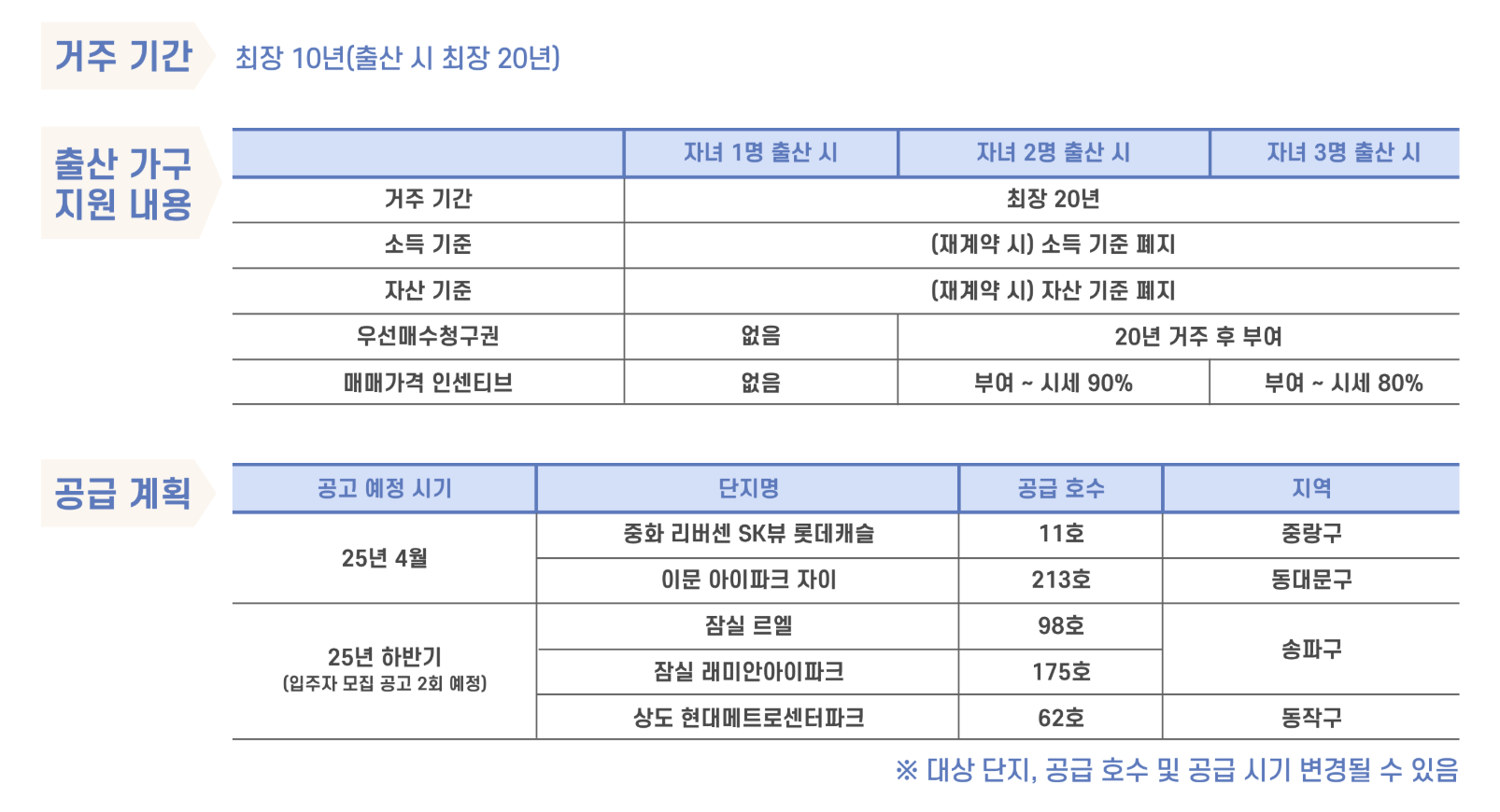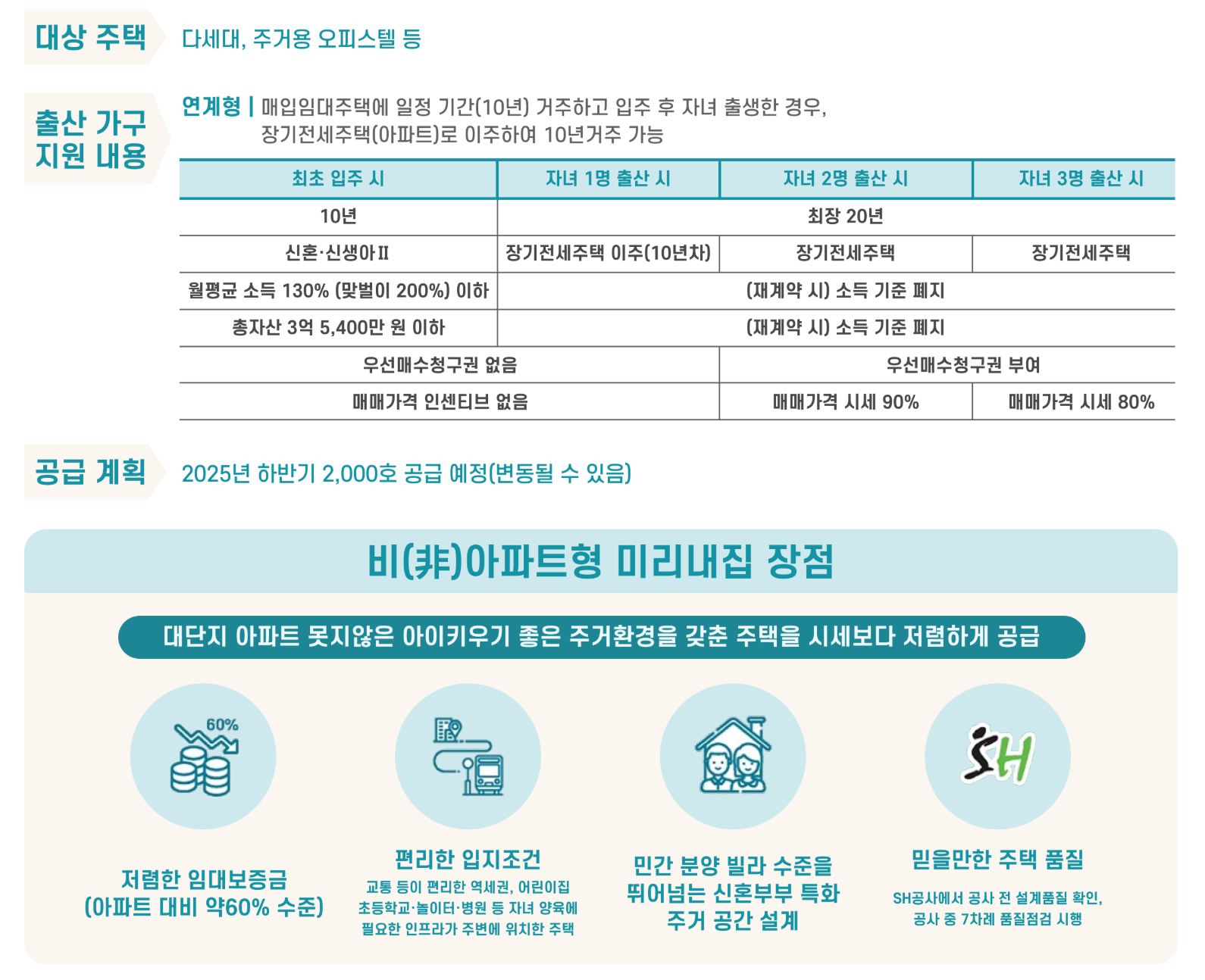 - 출산 인센티브: 입주 후 자녀 출산 시 거주 연장, 다자녀일수록 혜택 강화.