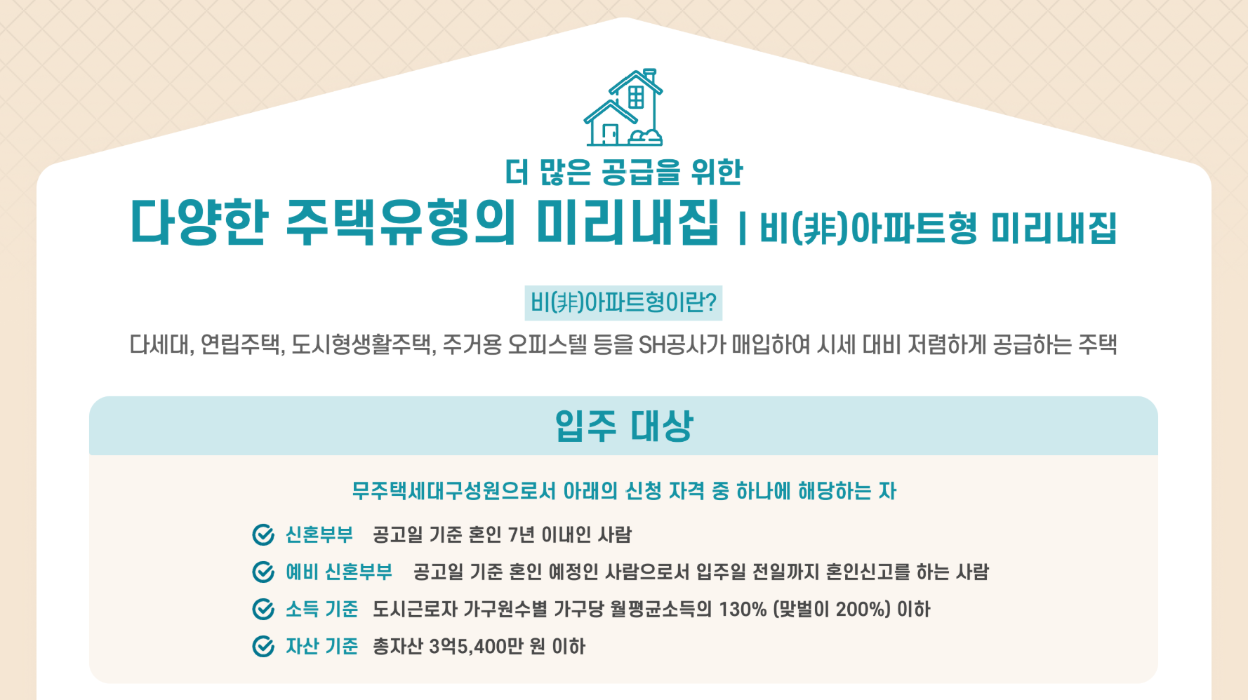 - 예비 신혼부부: 입주 전까지 혼인신고 예정인 커플 (혼인 예정 증빙 필요)