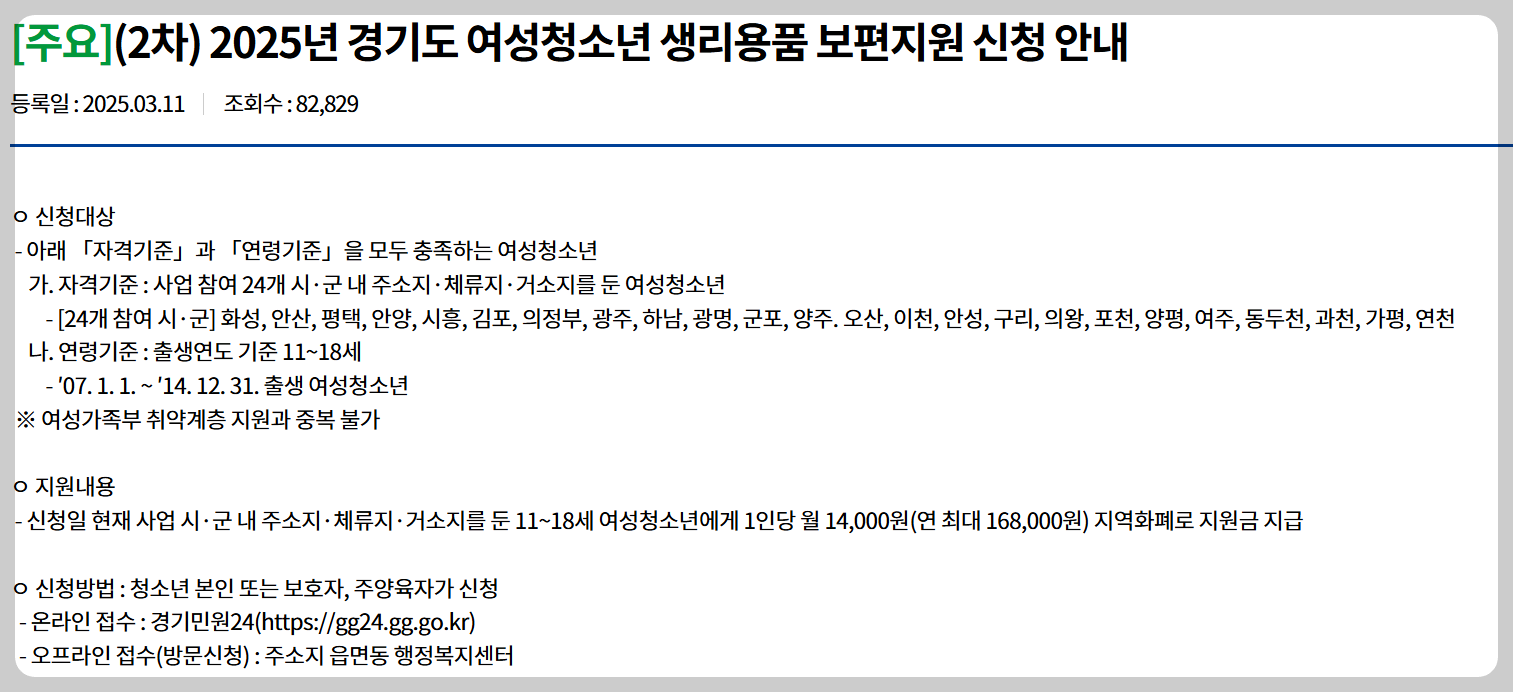 - 지원 방식: 학교 내 생리용품 비치 + 저소득층 청소년 대상 바우처 지급