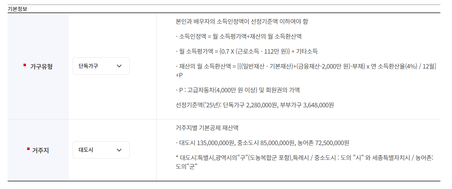 소득인정액이 ‘선정기준액’ 이하인 경우에만 지급됩니다. 2025년 기준 선정기준액은 다음과 같습니다.