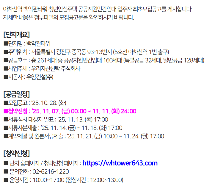 서울 광진구 중곡동에 위치한 ‘아차산역 백악관타워 청년안심주택’이 2025년 10월 28일자로 입주자 모집공고를 발표하였습니다. 이번 단지는 5호선 아차산역 1번 출구 인근에 위치한 역세권 주거지로, 청년층과 신혼부부의 주거 안정을 지원하기 위한 공공지원 민간임대주택 형태로 공급됩니다. 청년안심주택은 서울시와 민간사업자가 협약을 체결하여 공급하는 주택으로, 공공임대와 민간임대가 혼합된 구조를 가지고 있습니다. 특히 이번 백악관타워 단지는 총 261세대 중 160세대가 공공지원 민간임대로 공급되며, 그중 청년 특별공급·일반공급 및 신혼부부 특별공급이 함께 진행됩니다. 공급 및 접수는 모두 온라인으로만 진행되며, 청약을 희망하는 청년과 신혼부부는 반드시 일정과 자격요건을 숙지해야 합니다.