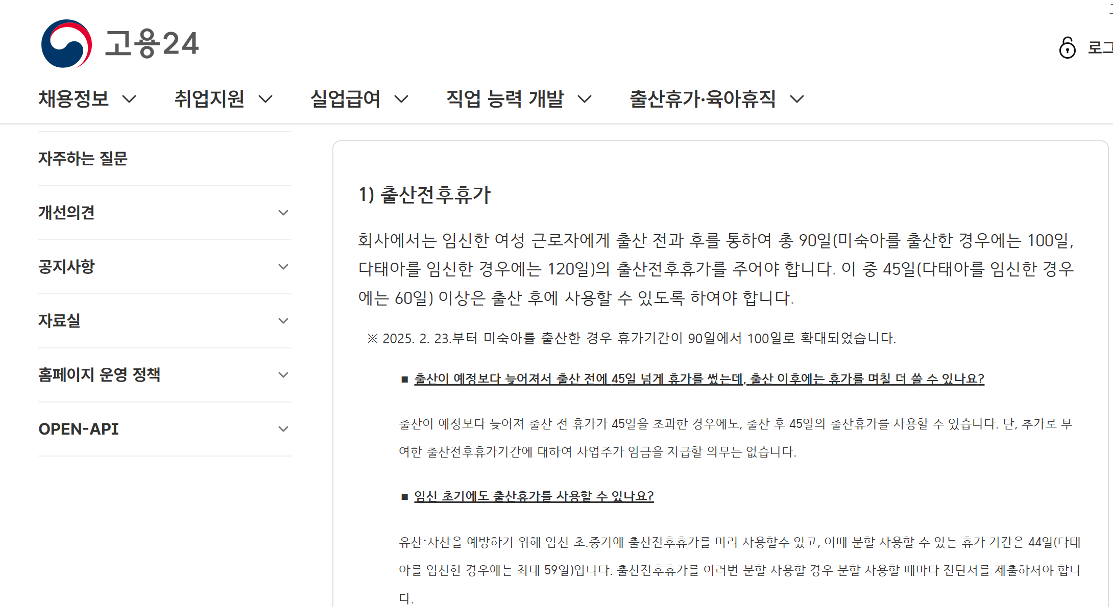 임신 중 불가피하게 유산 또는 사산한 경우에도 근로자의 회복을 위해 일정 기간 유급휴가가 제공됩니다.- 지원 대상: 유산·사산 사실이 의학적으로 확인된 근로자 - 지원 기간: 임신 기간에 따라 5일~90일 - 급여 금액: 출산전후휴가급여와 동일한 기준 적용