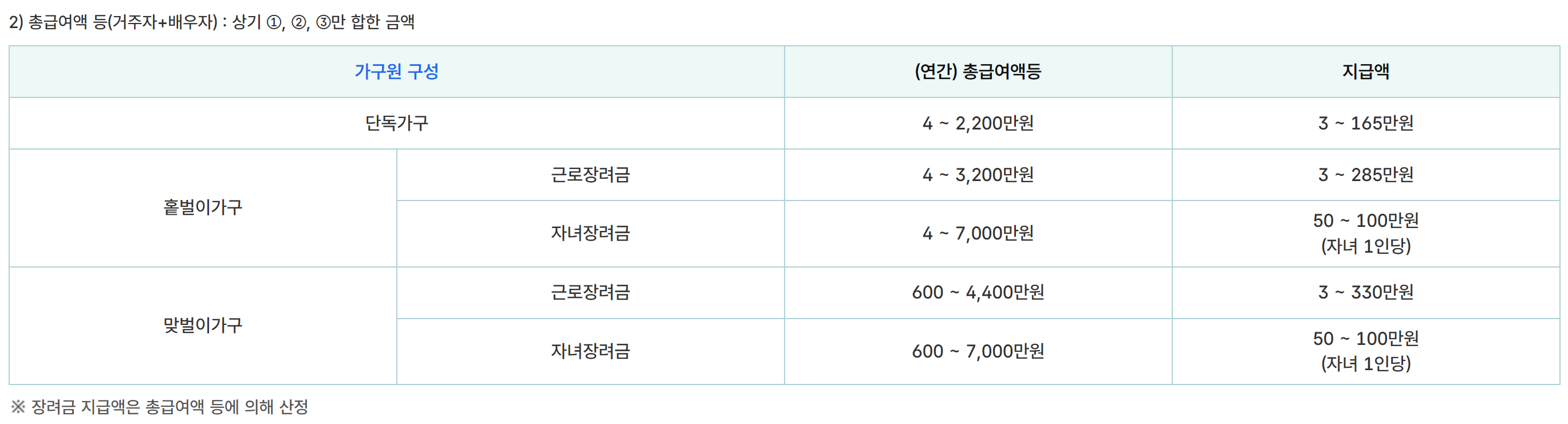| 홑벌이 가구 | 3,200만 원 미만 | 285만 원 |
